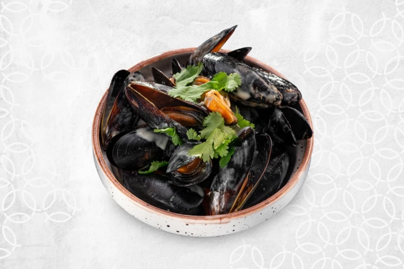 Мидии голубые, сливки, сыр дорблю, лук, чеснок, петрушка, кинза. Подается с хлебом чиабатта