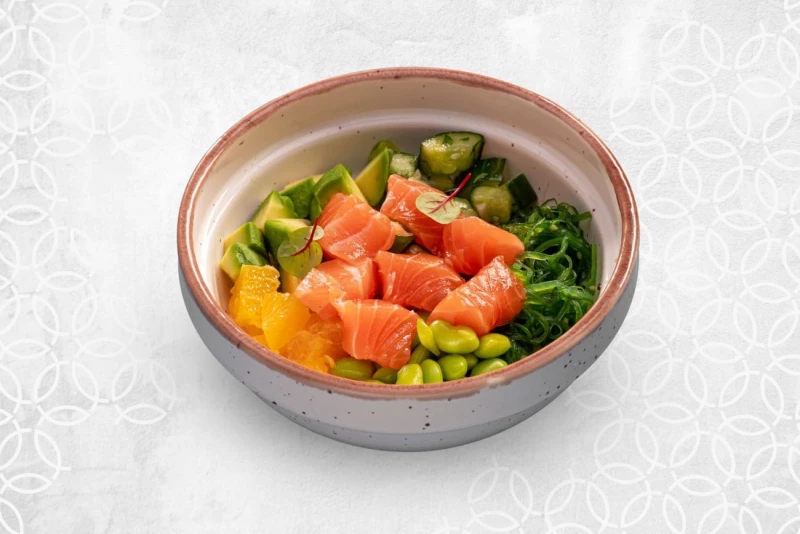 Рис, филе лосося, соус ореховый, соус сливочный унаги, салат чука, апельсин, бобы эдамаме, битые огурцы, авокадо, кунжут