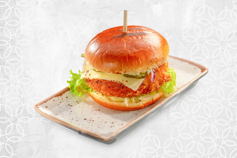 Булочка, котлета из трески и лосося,сыр плавленый, айсберг, соус тартар,огурцы маринованные, лук красный